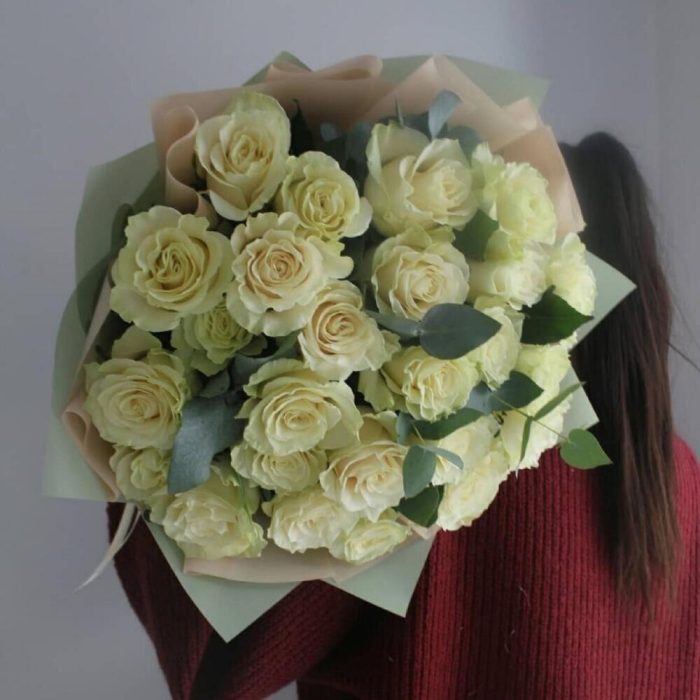 25 белых роз с шикарным эвкалиптом