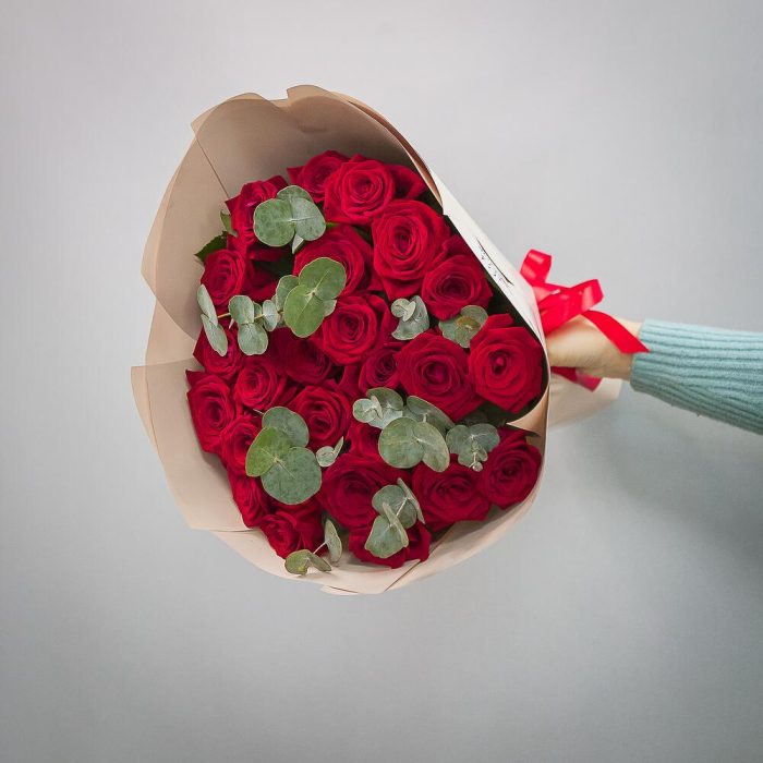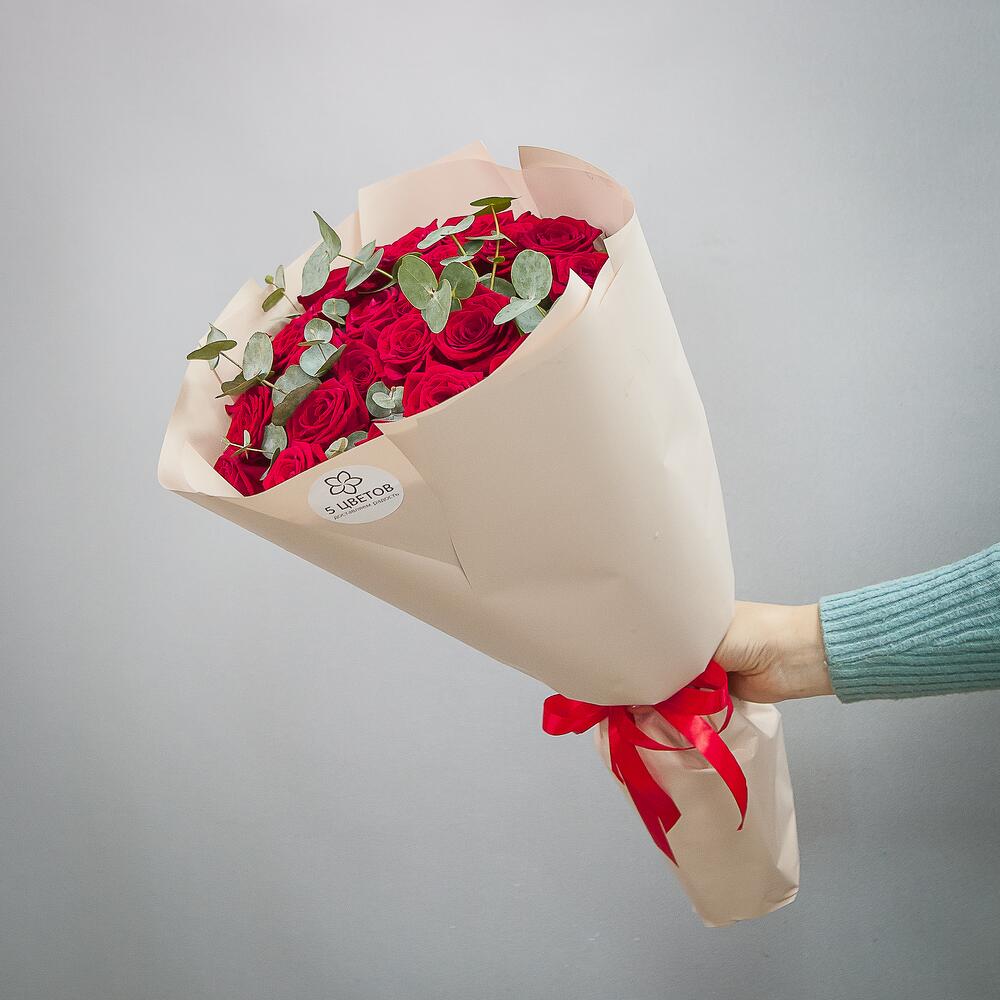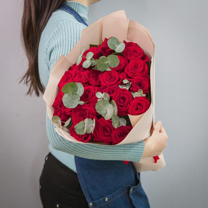 25 красных роз с эвкалиптом