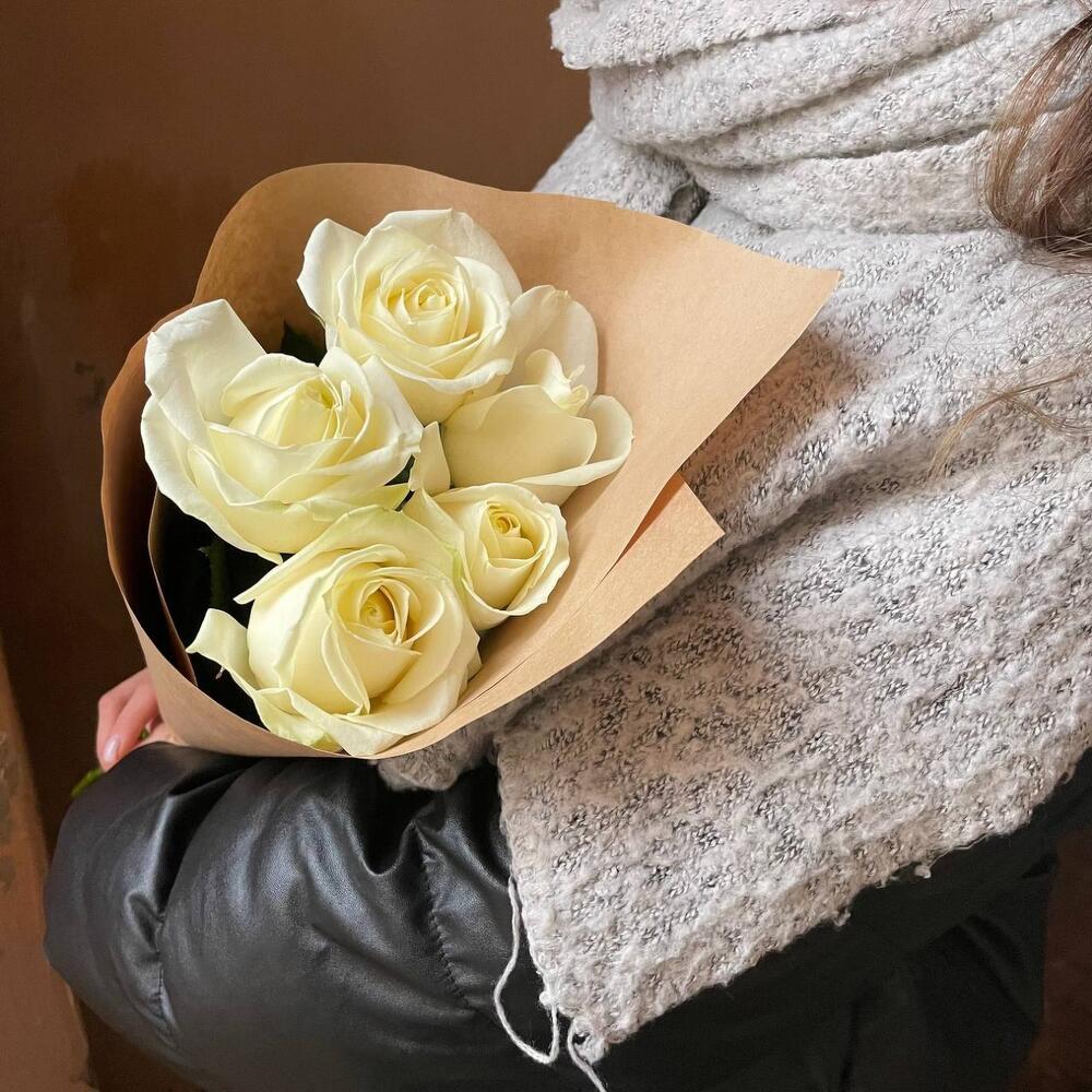 Крафт упаковка – 1 шт.Роза белая россия – 5 шт.