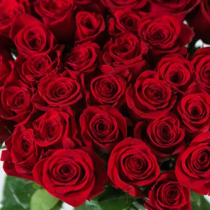 Роза красная – 51 шт.Лента атласная – 1 шт.Пленка прозрачная – 1 шт.