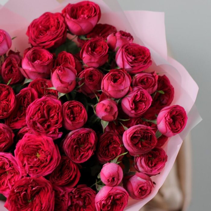 Лента атласная – 1 шт.Кустовая роза пионовидная – 9 шт.Матовая пленка – 3 шт.