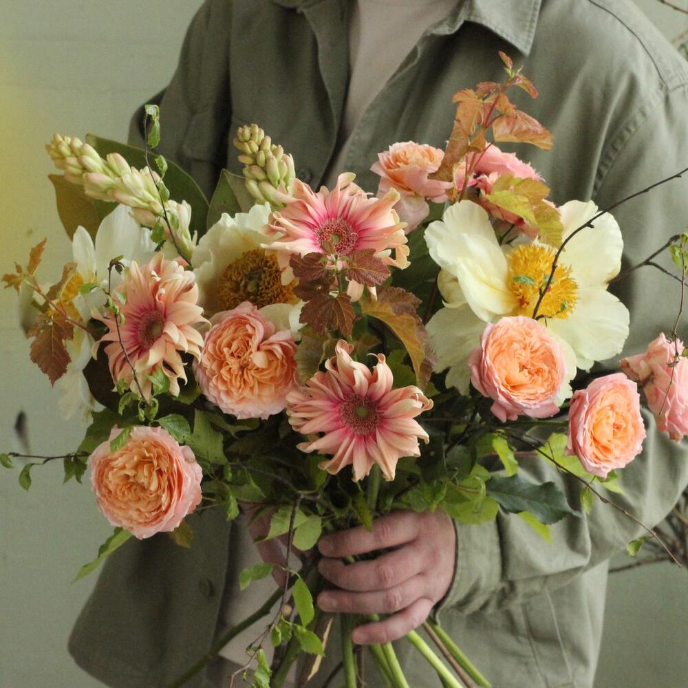 Лента – 1 шт.Пион – 3 шт.Роза кустовая пионовидная – 3 шт.тубироза – 2 шт.пузыреплодник – 3 шт.гербера кучерявая – 3 шт.зелень ветки – 3 шт.