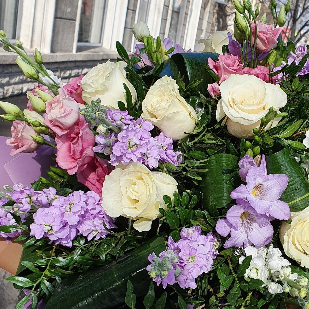 Маттиола – 10 шт.Лизиантус – 7 шт.Фрезия – 7 шт.Аспидистра лист – 8 шт.Роза Эквадор – 9 шт.Фисташка – 10 шт.Упаковка дизайнерская – 3 шт.Лента атласная – 1 шт.