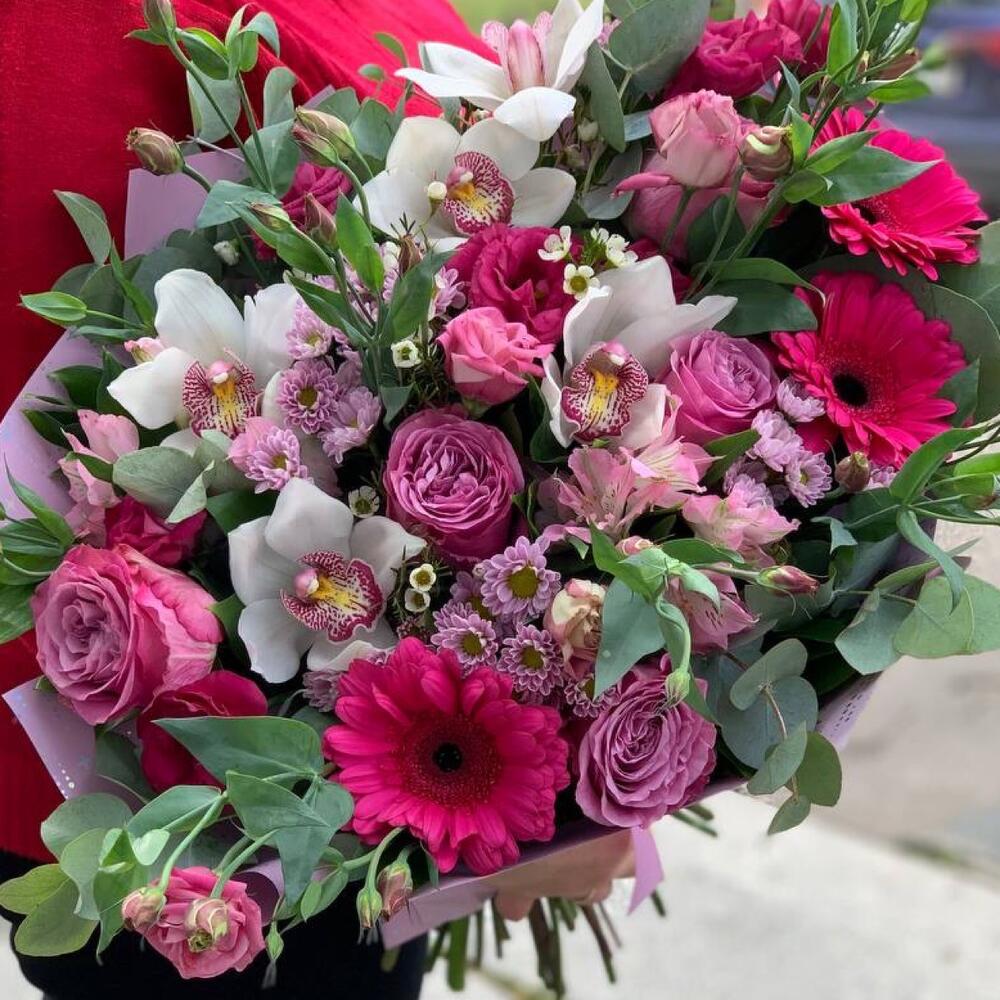 Хризантема Сантини – 4 шт.Альстромерия – 2 шт.Орхидея Цимбидиум – 5 шт.Гербера – 3 шт.Роза пионовидная – 5 шт.Лизиантус – 3 шт.Ваксфлауэр – 2 шт.Эвкалипт – 1 шт.Рускус – 25 шт.Упаковка дизайнерская – 2 шт.Лента атласная – 1 шт.