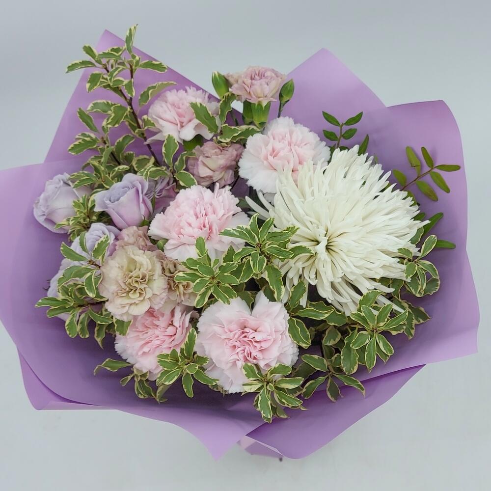 Хризантема одноголовая – 1 шт.Роза кустовая – 1 шт.гвоздика сортовая (диантус) – 5 шт.Гвоздика кустовая – 2 шт.зелень питтоспорум – 1 шт.зелень пистация – 2 шт.Упаковка пленка матовая – 3 шт.Лента атласная – 2 шт.