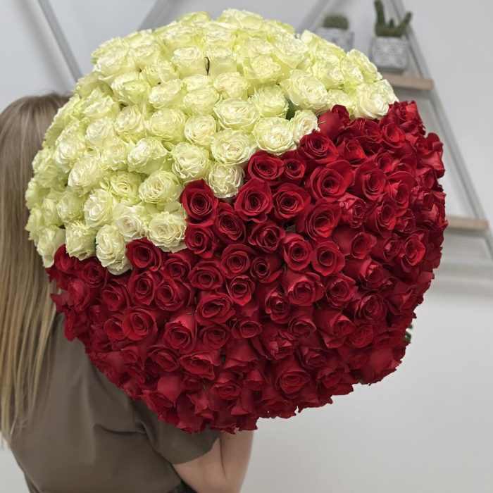 роза крансая – 101 шт. Роза белая – 100 шт. Оформление лента – 1 шт.