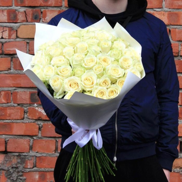 Роза Аваланж – 51 шт.Лента атласная – 1 шт.упаковочный материал – 3 шт.