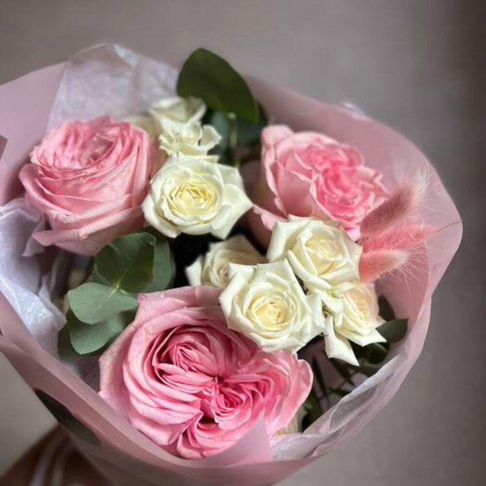 Пионовидная роза – 3 шт.Пионовидная кустовая роза – 2 шт.Эвкалипт – 2 шт.Лагурус – 3 шт.декоративная упаковка – 1 шт.Атласная лента – 1 шт.