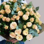 бежевые пионовидные розы – 51 шт.Лента атласная – 2 шт.Открытка – 1 шт.инструкция по уходу за цветами – 1 шт.хорошее настроение – 100 шт.коробка переноска – 1 шт.Кризал – 1 шт.Эвкалипт – 20 шт.