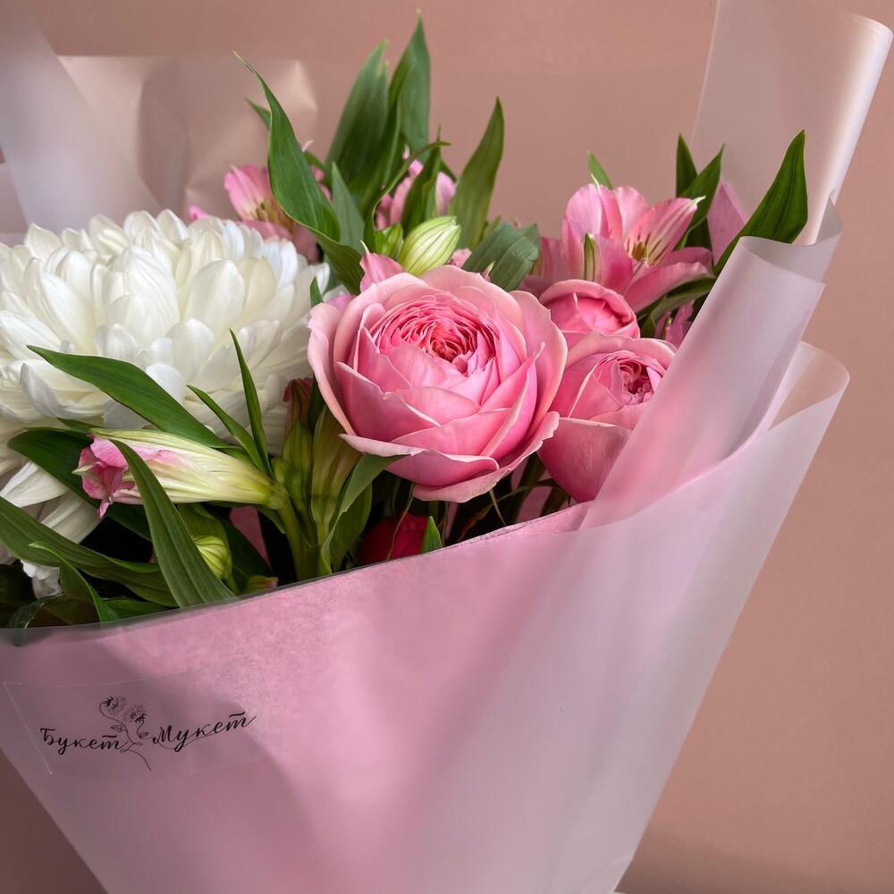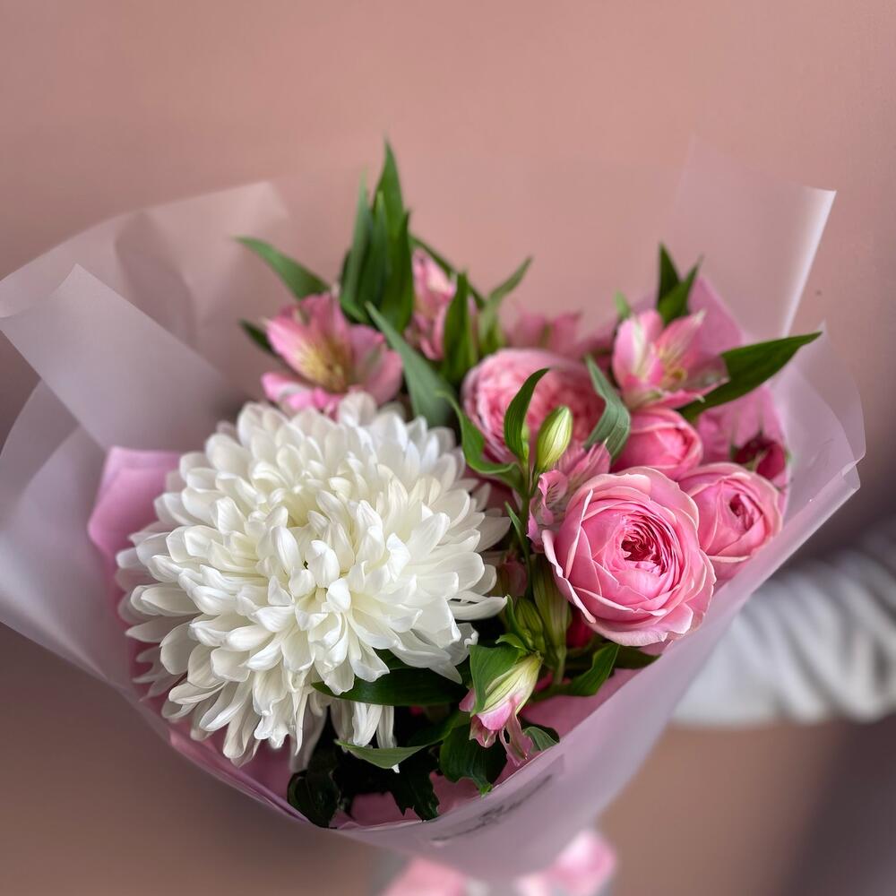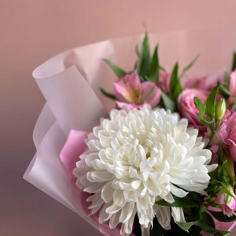 Альстромерия – 3 шт.Лента атласная – 1 шт.Тишью – 1 шт.Пленка – 2 шт.Хризантема Антонов – 1 шт.роза кустовая пионовидная кения – 1 шт.