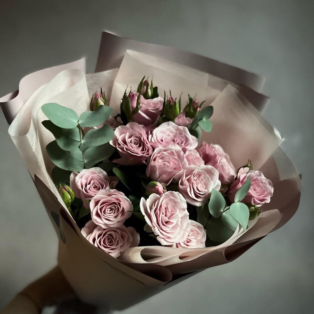 Кустовая роза – 5 шт.Эвкалипт – 3 шт.декоративная упаковка – 1 шт.Атласная лента – 1 шт.