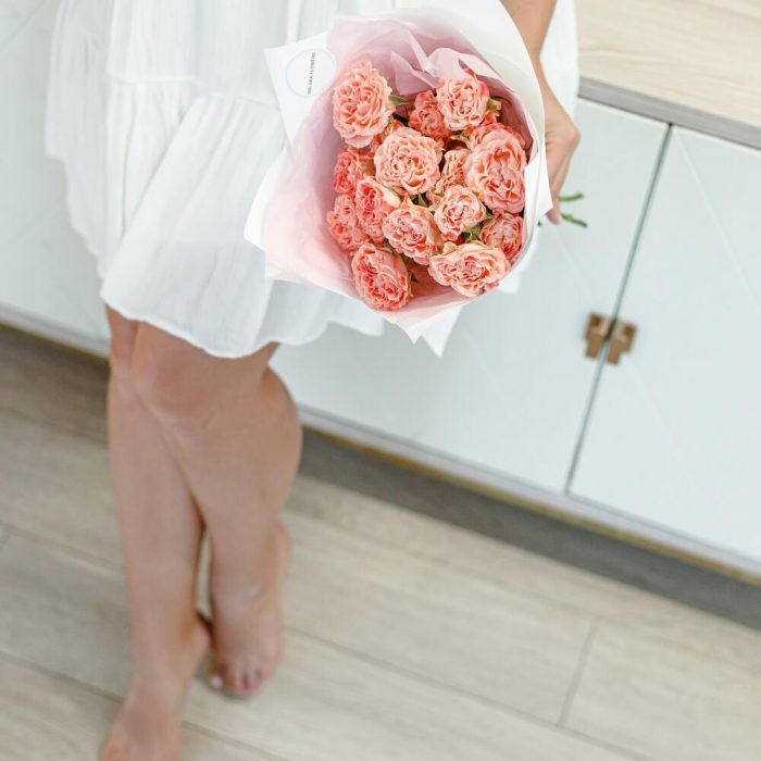 Роза кустовая пионовидная – 5 шт.Тишью – 2 шт.Корейская пленка – 2 шт.Атласная лента – 1 шт.инструкция по уходу за цветами – 1 шт.крафтовый пакет – 1 шт.