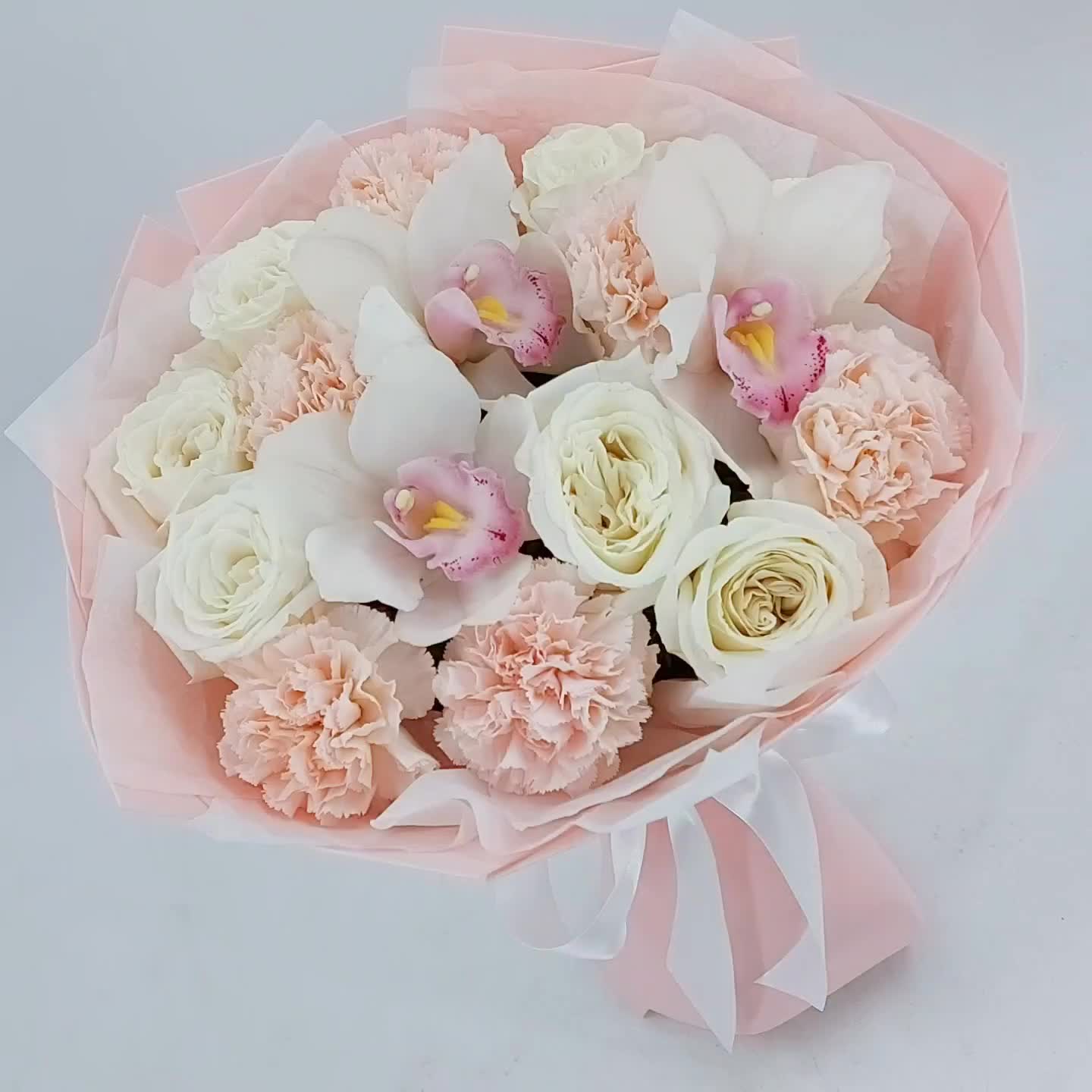 Роза Эквадор – 7 шт.Упаковка дизайнерская – 1 шт.Пистация – 5 шт.Орхидея цимбидиум бутон – 3 шт.гвоздика сортовая (диантус) – 6 шт.