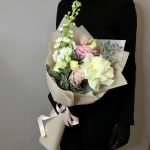 Маттиола – 1 шт.Кустовая роза – 1 шт.Роза Эквадор – 1 шт.Эустома – 1 шт.Лента атласная – 1 шт.Фисташка – 2 шт.Французская роза – 1 шт.Пленка матовая – 1 шт.подкормка для срезанных цветов – 1 шт.
