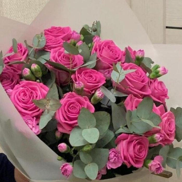Букет из розовых роз и эвкалипта «Искушение»