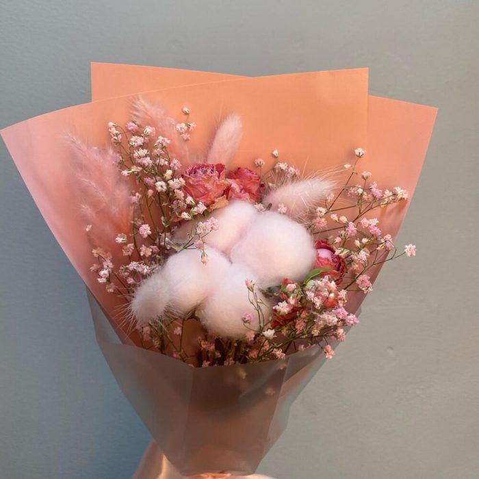 Хлопок – 1 шт.Роза кустовая – 1 шт.Лагурус – 3 шт.Гипсофила – 1 шт.Помпасная трава – 2 шт.Авторская упаковка – 1 шт.Открыточка с вашими пожеланиями – 1 шт.