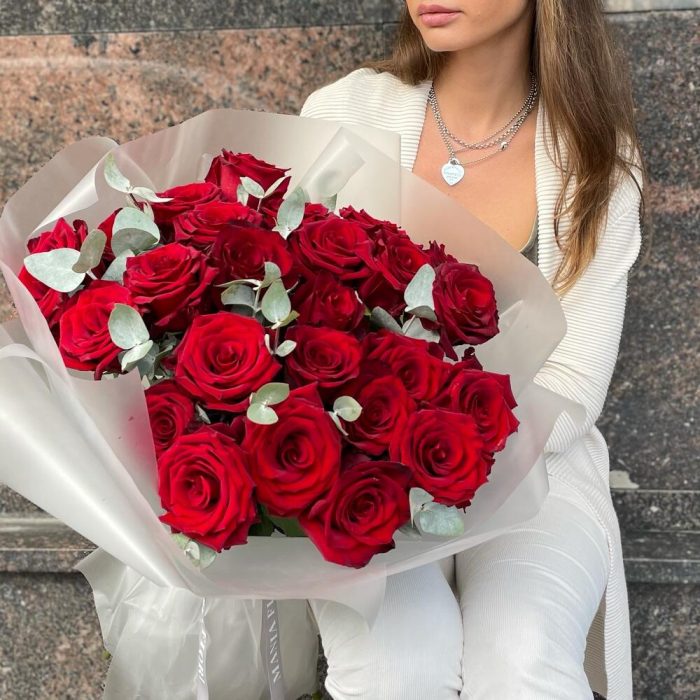 Роза красная Эквадор – 21 шт.Эвкалипт – 2 шт.Подарочная упаковка – 1 шт.Средство для продления жизни цветов – 1 шт.