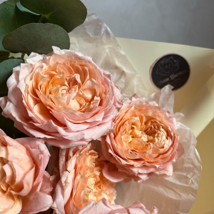 Кустовая роза – 1 шт.Эвкалипт – 3 шт.декоративная упаковка – 1 шт.Атласная лента – 1 шт.