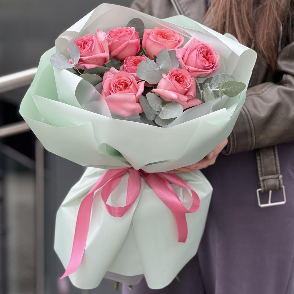 Эвкалипт – 2 шт. Оформление – 1 шт. роза пинк экспрешен – 7 шт.