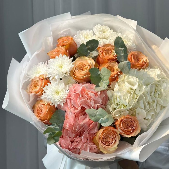 Яркий букет с гортензией и пионами