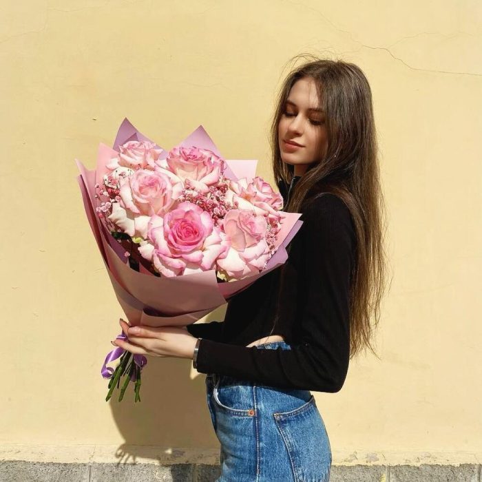 Роза французская – 7 шт.Гипсофила – 1 шт.Упаковка корейская пленка – 1 шт.Лента – 1 шт.