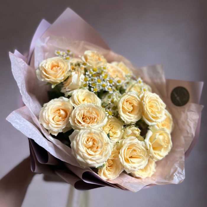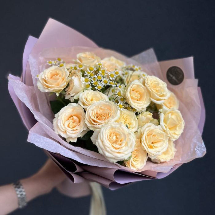 Кустовая роза – 3 шт.Танацетум – 3 шт.декоративная упаковка – 1 шт.Атласная лента – 1 шт.