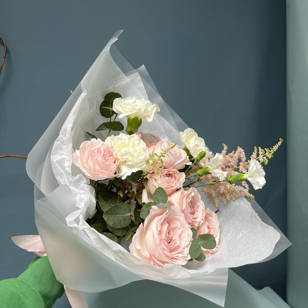 Астильба – 2 шт.Роза кустовая – 2 шт.Эвкалипт – 2 шт.Гвоздика – 3 шт.Лента атласная – 1 шт.Тишью – 1 шт.Кустовая гвоздика – 1 шт.Упаковка дизайнерская – 2 шт.