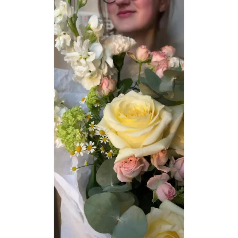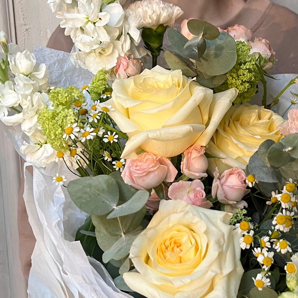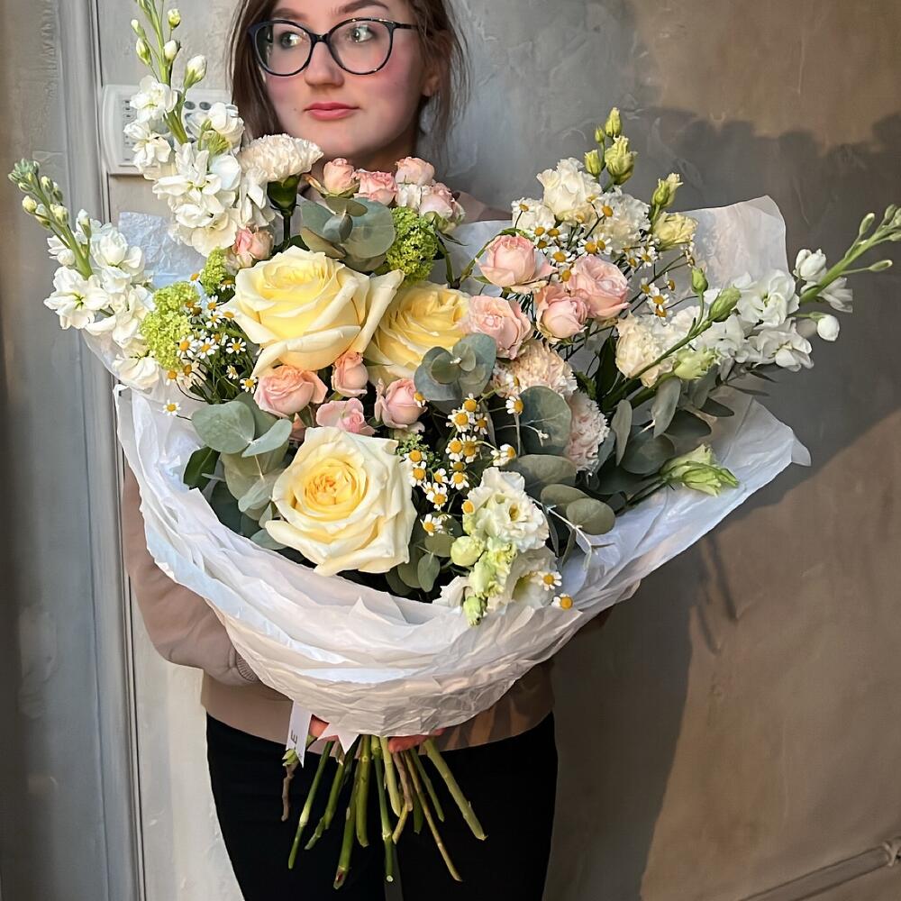 Вибурнум – 2 шт.Лизиантус – 2 шт.Маттиола – 3 шт.Роза кустовая – 3 шт.Эвкалипт – 2 шт.Матрикария – 3 шт.Роза пионовидная – 3 шт.Упаковка дизайнерская – 1 шт.