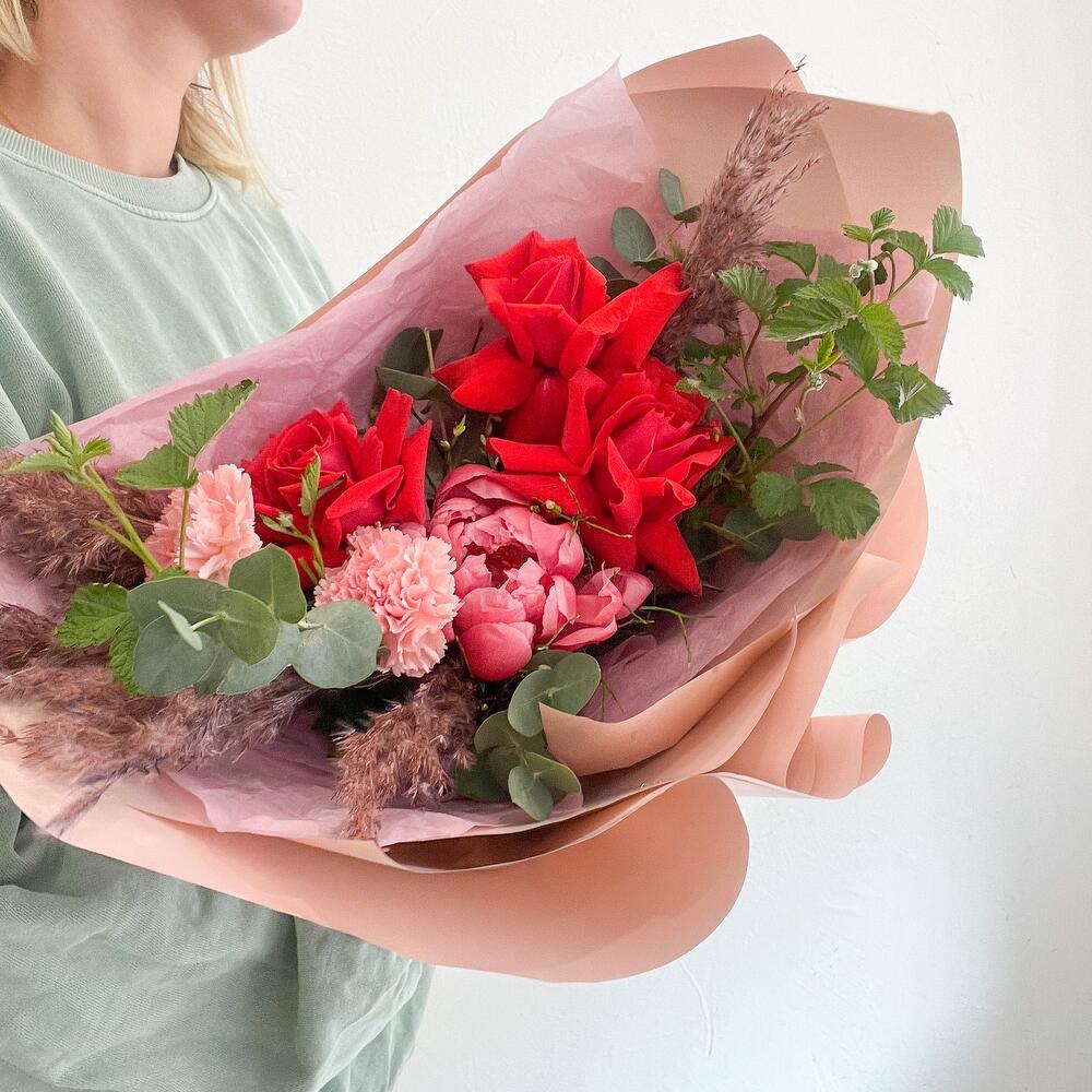 Пион Коралл Шарм (Coral Charm) – 1 шт.Эвкалипт – 3 шт.Лента атласная – 1 шт.Тишью – 1 шт.Диантус – 2 шт.Роза французская – 3 шт.Ветки малины – 2 шт.Тростник – 5 шт.Аквапак – 1 шт.Корейская пленка – 3 шт.черничик – 4 шт.