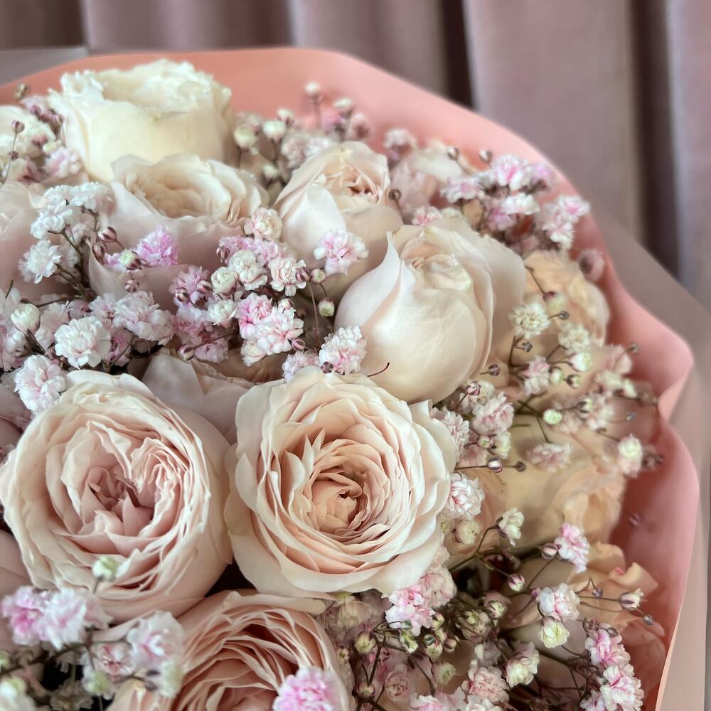 Гипсофила – 9 шт.Кустовая пионовидная роза – 8 шт.декоративная упаковка – 1 шт.Атласная лента – 1 шт.