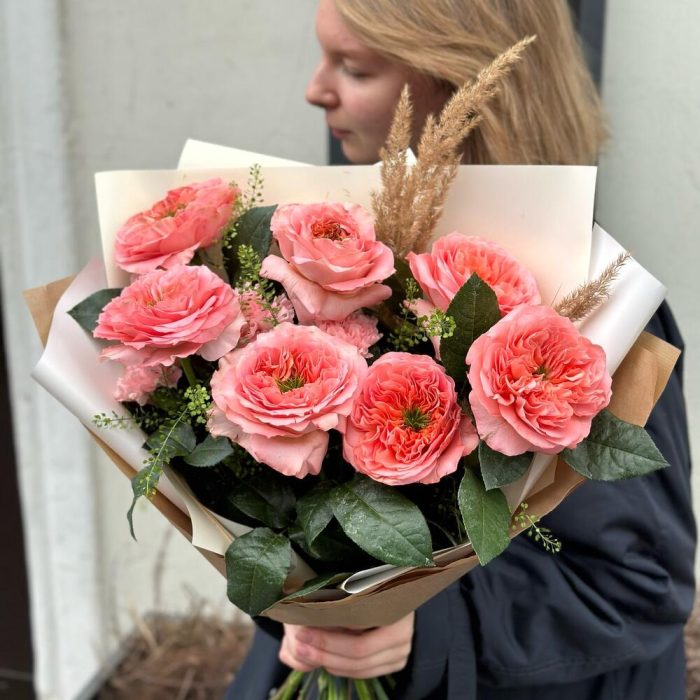 Букет 15: пионовидные розы, ковыль и другие цветы