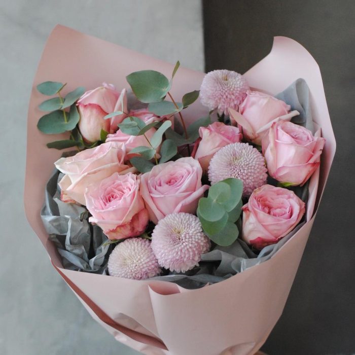 Роза пионовидная – 9 шт.момоко хризантема – 4 шт.Эвкалипт – 4 шт.