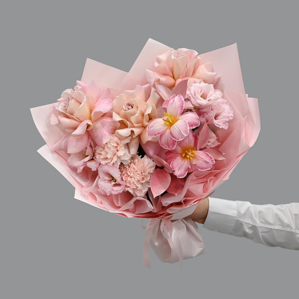 Категории: Гвоздики, Лизиантусы, Розы, Тюльпаны