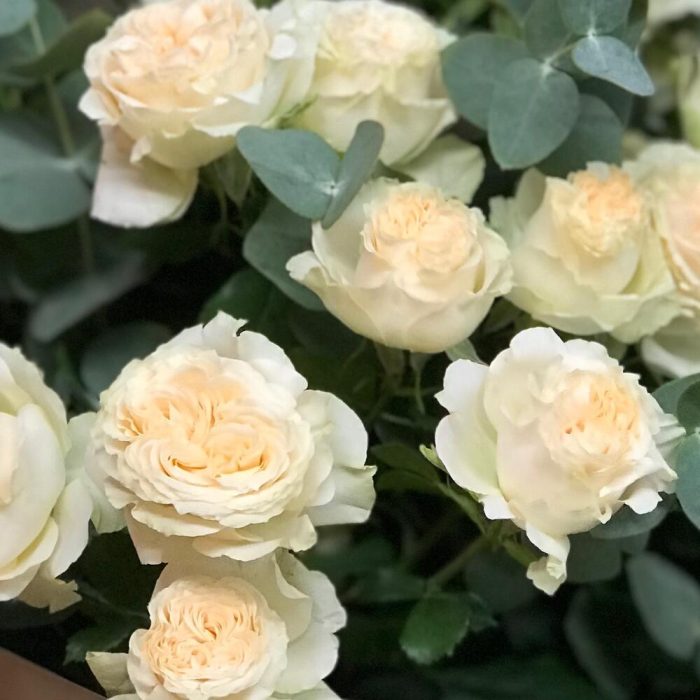 роза кустовая пионовидная саммер – 5 шт.эвкалипт цинерея пучок – 1 шт.Упаковка дизайнерская – 1 шт.