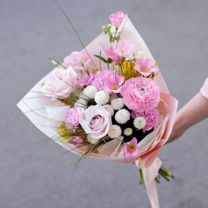 лизиантус ботаника – 1 шт.Ранункулюс – 1 шт.Роза – 2 шт.Диантус – 3 шт.Хризантема кустовая – 2 шт.Берграсс – 20 шт.каапс микс – 2 шт.Оксипеталум – 2 шт.Упаковка дизайнерская – 1 шт.