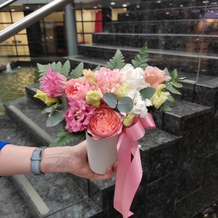 Лента – 2 шт.Лизиантус – 2 шт.Папоротник – 2 шт.Гвоздика – 1 шт.Роза кустовая пионовидная – 1 шт.Стакан – 1 шт.