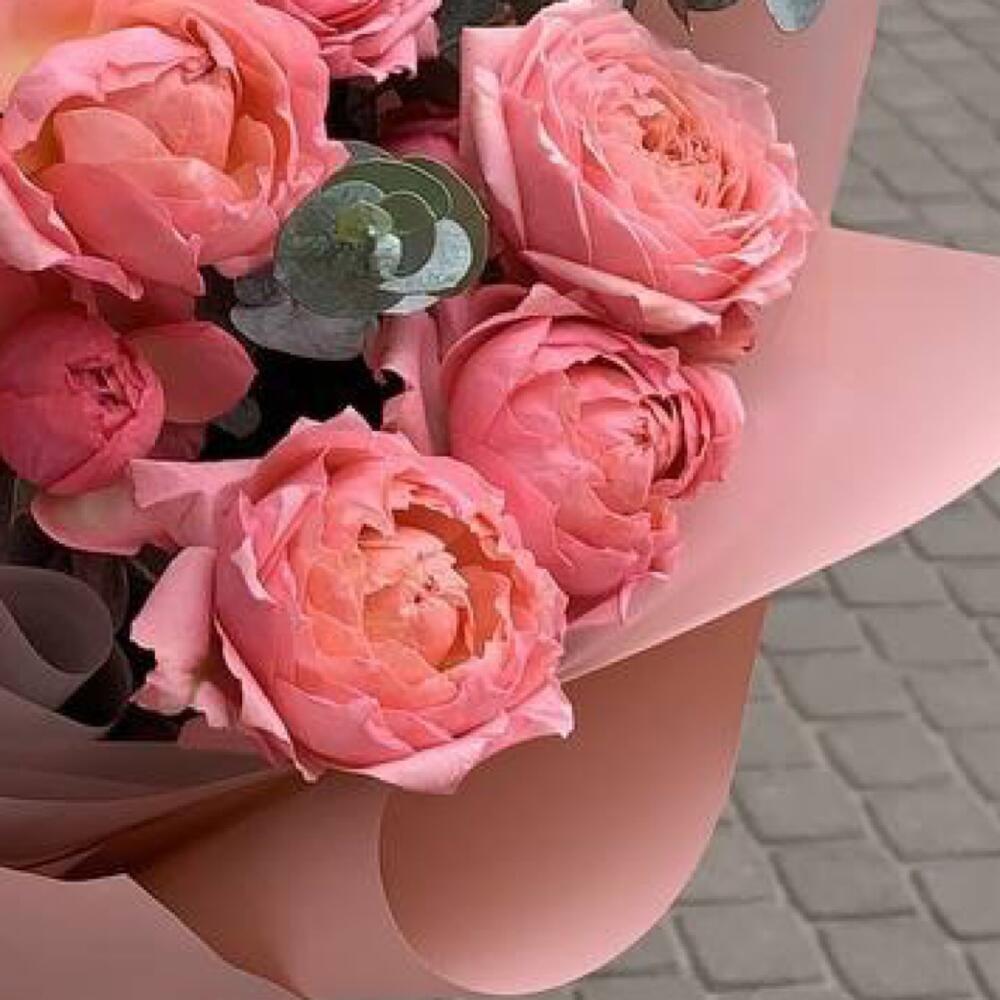 Роза пионовидная – 3 шт.Эвкалипт Микс – 5 шт.Упаковка дизайнерская – 3 шт.