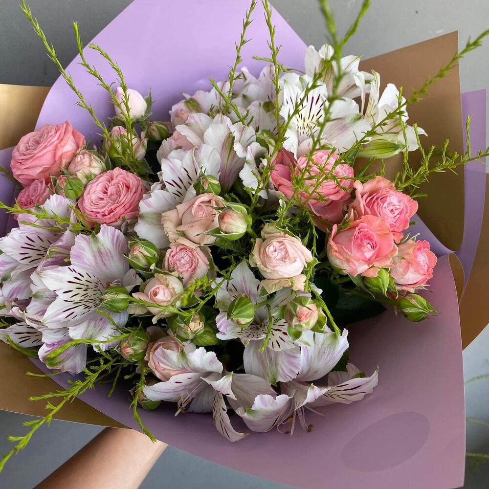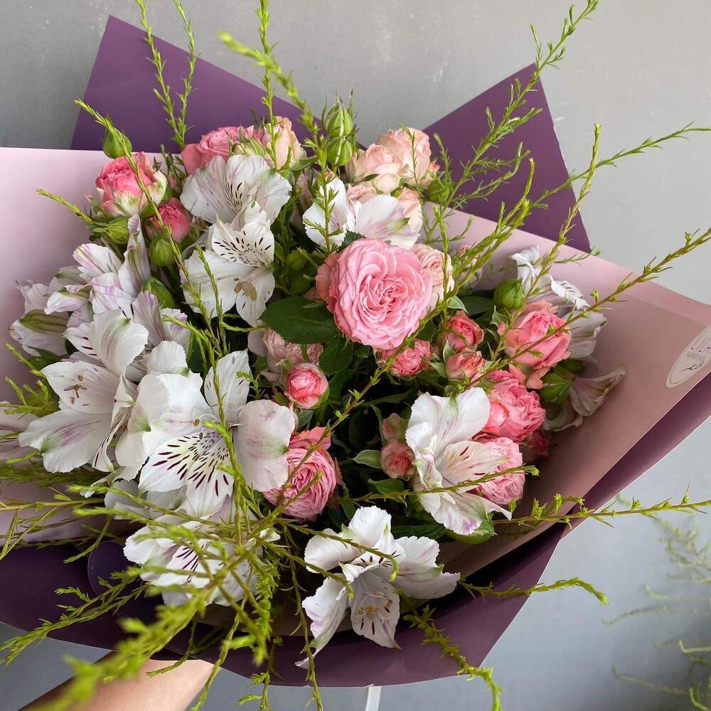 Альстромерия – 5 шт. Зелень – 3 шт. Спрей роза – 5 шт. Открыточка с вашими пожеланиями – 1 шт. Упаковка дизайнерская – 1 шт.