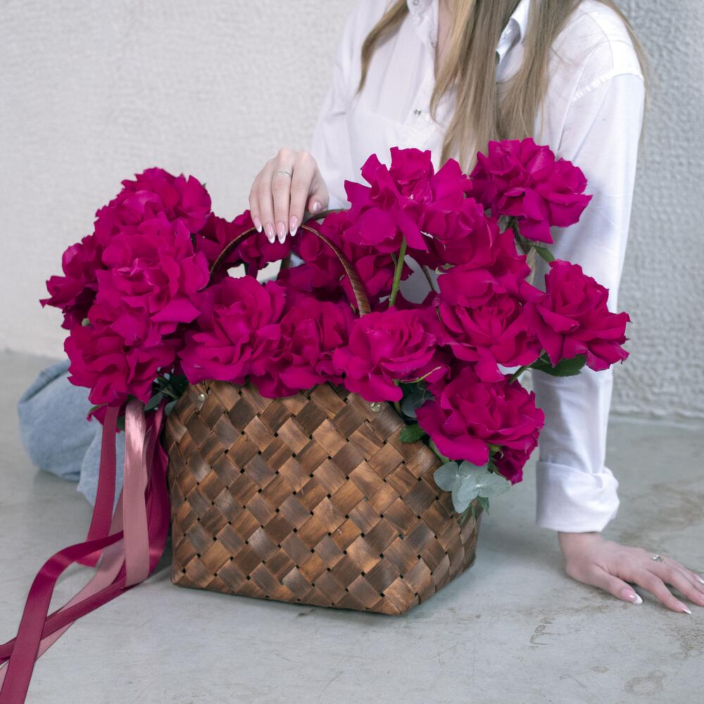 роза французская готча – 25 шт.Оазис – 1 шт.плетеная сумка – 1 шт.