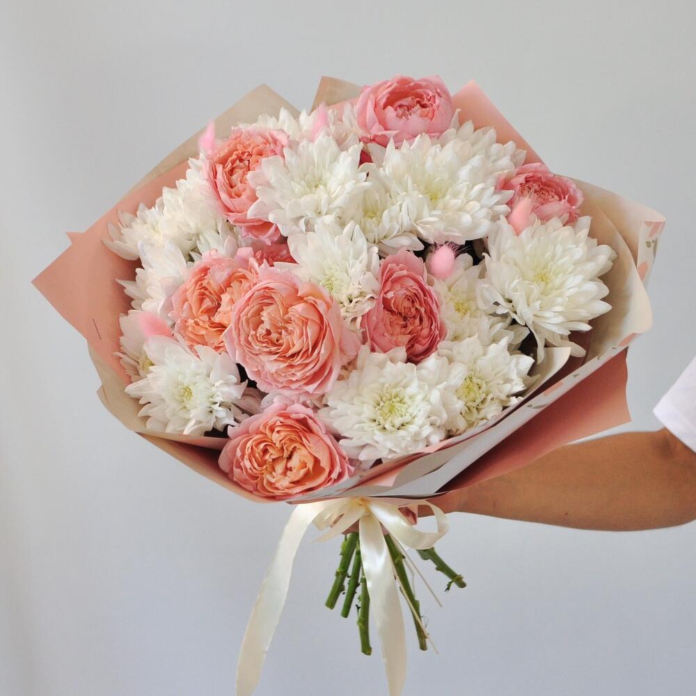 Хризантема кустовая – 5 шт.Роза пионовидная кустовая – 5 шт.Лагурус – 5 шт.Упаковка дизайнерская – 2 шт.Лента атласная – 1 шт.