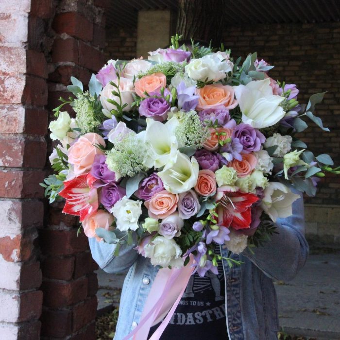 Амариллис – 5 шт.Роза Эквадор – 15 шт.Фрезия – 9 шт.Амми – 5 шт.Лизиантус – 11 шт.Эвкалипт – 11 шт.Фисташка – 7 шт.Тюльпан – 9 шт.Лента атласная – 3 шт.