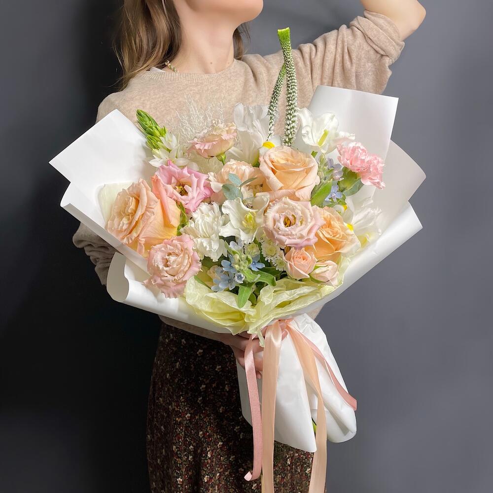 Вероника – 2 шт.Ирис – 2 шт.Лизиантус – 1 шт.Роза кремовая – 3 шт.Роза кустовая – 1 шт.Хризантема кустовая – 1 шт.Гвоздика – 2 шт.Орнитогалум – 1 шт.Оксипеталум – 2 шт.Упаковка дизайнерская – 1 шт.Тюльпан белый – 2 шт.