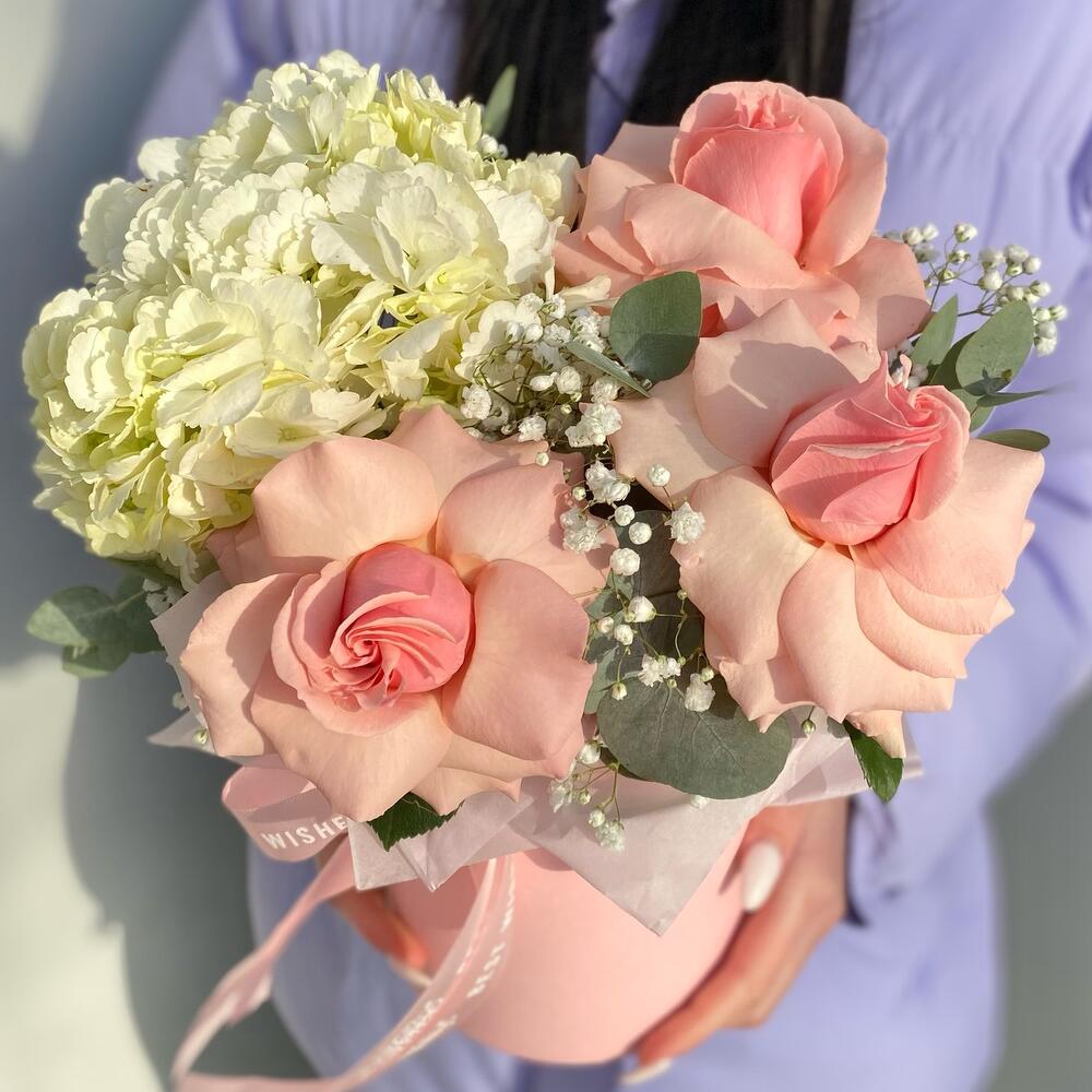 Гипсофила – 2 шт.Гортензия – 1 шт.Тишью – 1 шт.Коробка шляпная – 1 шт.Оазис флористический – 1 шт.Роза pink mondial – 3 шт.