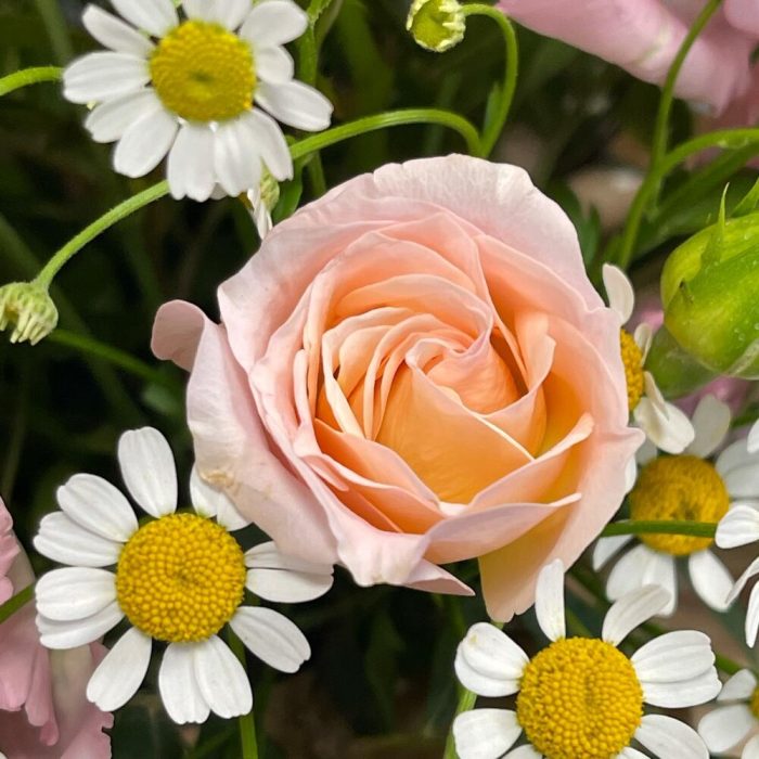 Лизиантус – 2 шт.Роза кустовая – 1 шт.Матрикария – 2 шт.Фисташка – 1 шт.Колоски – 3 шт.Упаковка дизайнерская – 1 шт.Оазис флористический – 1 шт.