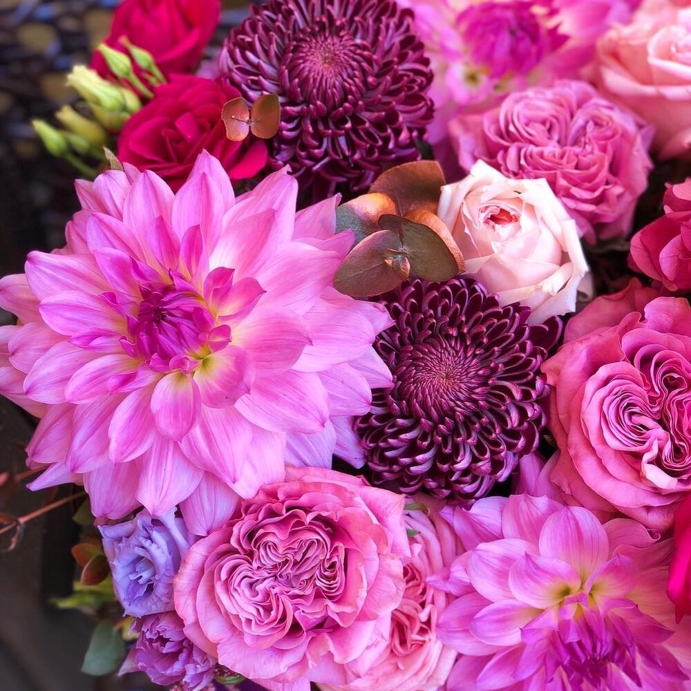 Гортензия – 1 шт.Георгина – 3 шт.бигуди хризантема – 2 шт.Астильба Европа – 3 шт.Пионовидный тюльпан – 3 шт.Пионовидная роза – 9 шт.Кустовая роза малиновая – 3 шт.Зелень – 1 шт.