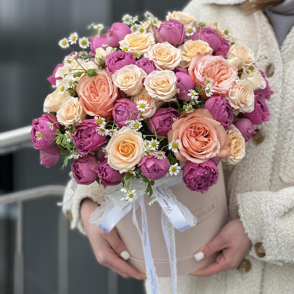 Стильная композиция из игривых ромашек, микса кустовых роз и одноголовых сорта Кахала!