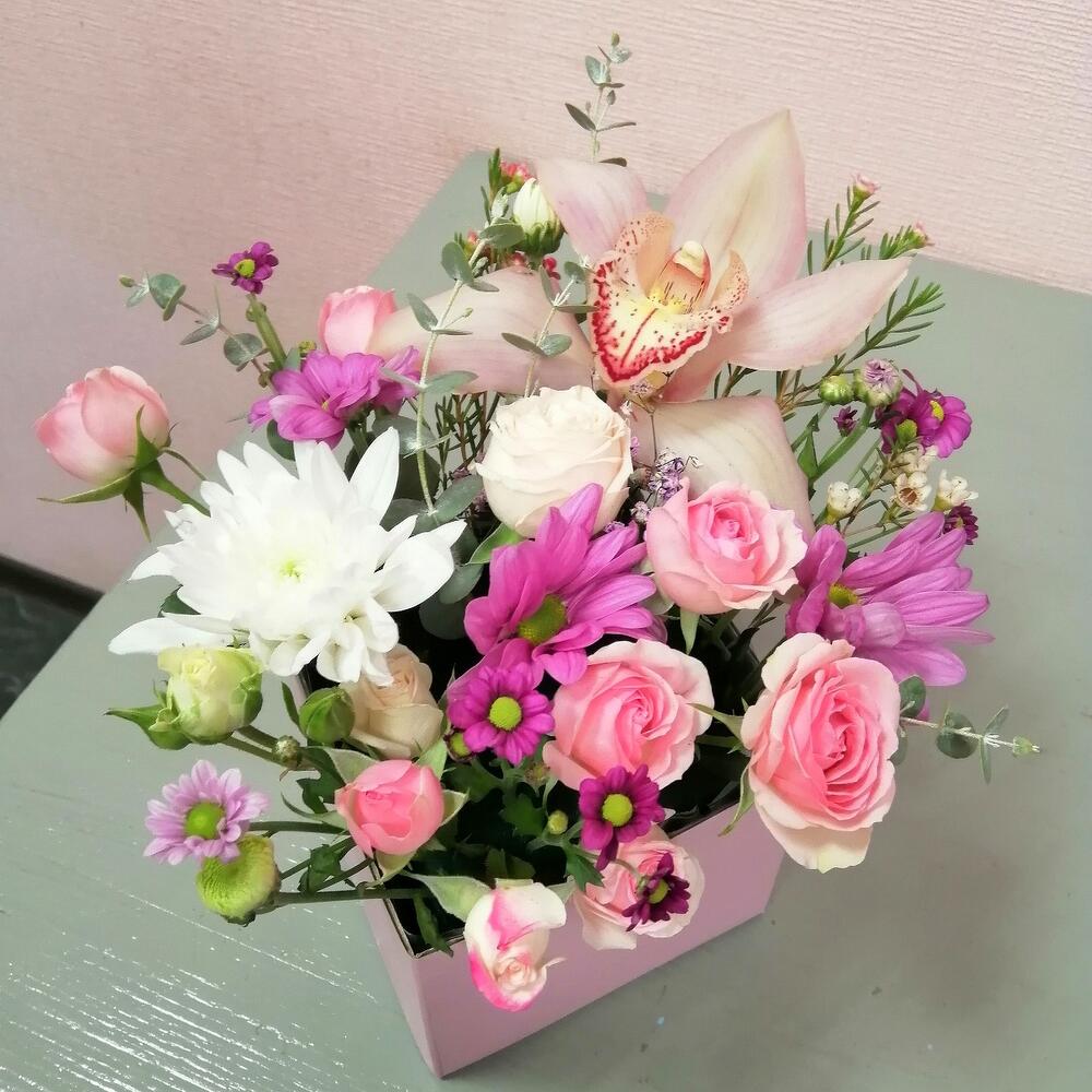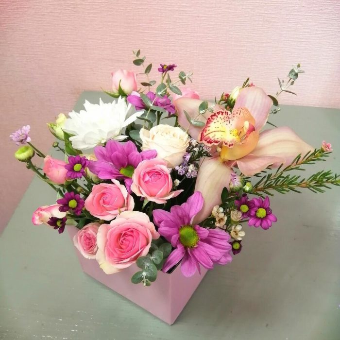 орхидея колокольчик – 1 шт.Роза кустовая – 1 шт.Хризантема кустовая – 1 шт.Ваксфлауэр – 1 шт.Оазис флористический – 1 шт.Коробка прямоугольная – 1 шт.Эвкалипт – 1 шт.