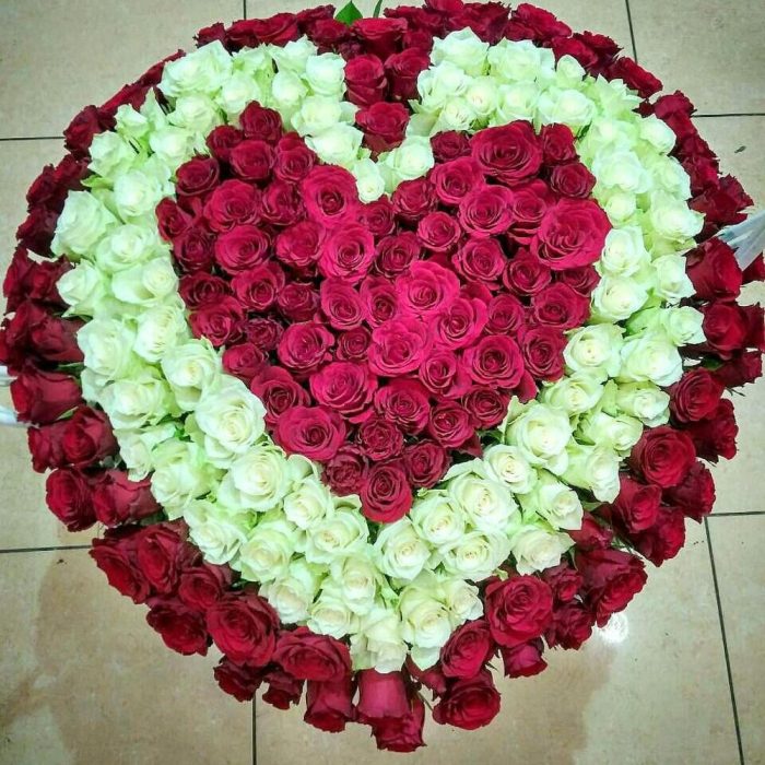 Роза красная – 150 шт.Роза белая – 51 шт.Корзина большая – 1 шт.