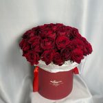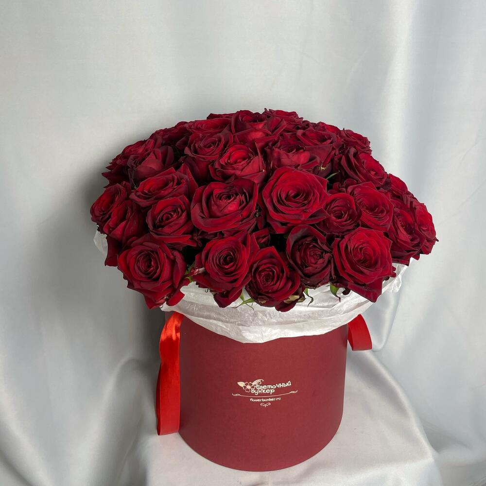 Роза красная 60 см – 51 шт.Шляпная коробка – 1 шт.Бумага тишью – 1 шт.Аквабокс – 1 шт.
