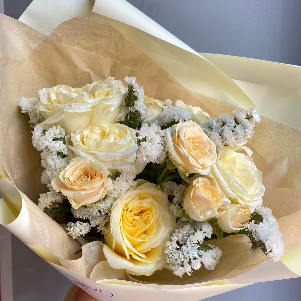 роза канделайт – 5 шт.Роза кустовая кремовая – 1 шт.Статица белая – 3 шт.Упаковка дизайнерская – 1 шт.тишью натуральная – 1 шт.Лента атласная – 1 шт.